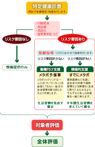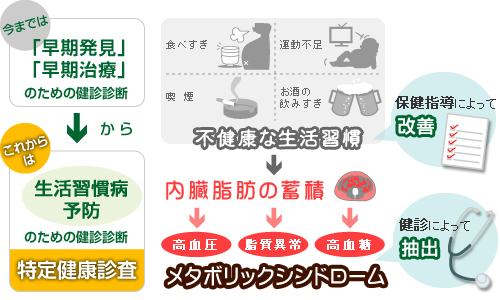 高血圧症や脂質異常症、糖尿病など生活習慣病の発症や重症化を予防することを目的として、メタボリックシンドロームの該当者および予備群の方を、この特定健康診査で的確に抽出させて、該当者と予備群の方の生活習慣改善を支援していこうというのが特定保健指導です。