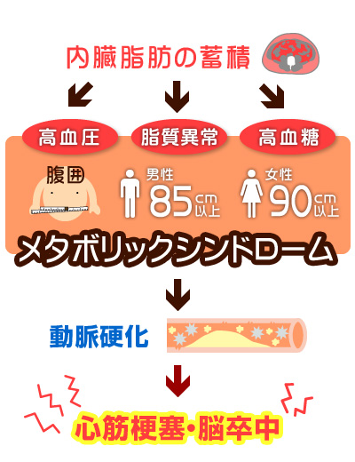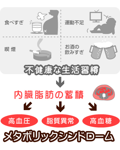 メタボリックシンドロームとは、食べすぎや運動不足などの生活習慣から内臓脂肪を蓄積することで、高血圧や脂質異常、高血糖という複数の危険因子を呼び覚まし、心筋梗塞や脳卒中といった命に関わる病気を引き起こす症候群なのです。