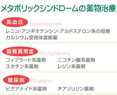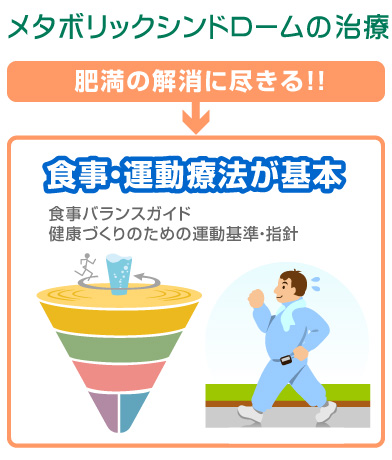 メタボリックシンドロームは食べ過ぎや運動不足という生活習慣から来る肥満が基盤にあるため、適切な食事・運動療法を行って肥満を解消することが基本になります。しかし、現に高血圧や脂質異常症、糖尿病を合併している人ではこれら合併症に対する薬物療法が中心になります。