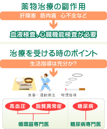 前記(Q5)の薬剤ではまれに肝障害や筋肉痛、心不全などの重篤な副作用を引き起こすことがあります。治療効果を確認する上でも定期的な血液検査や心臓機能検査が必要になります。また体調に異変を感じたら、薬を休んで医師に相談するのが良いでしょう。