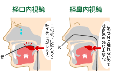 経鼻内視鏡は鼻からの胃カメラです。従来の口からの内視鏡検査(経口内視鏡検査)にくらべて、下記のようなメリットがあります。